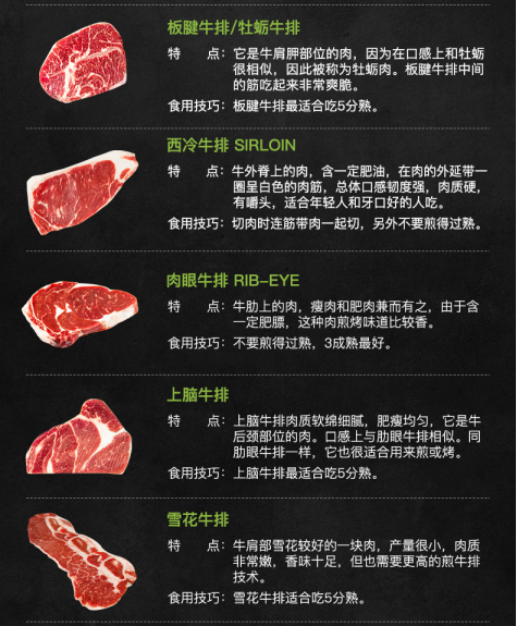 RIB-EYE(肉眼牛扒),瘦肉和肥肉兼而有之,由于含一定肥膘,这种肉煎烤味道比较香。食用时不要煎得过熟,3成熟最好。