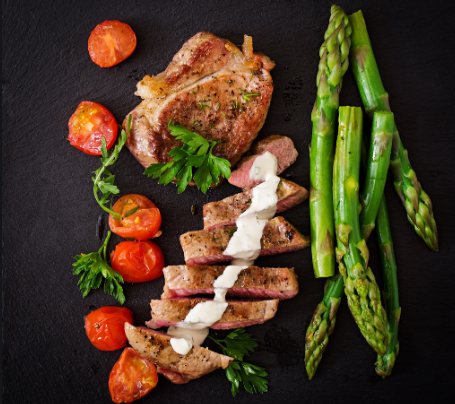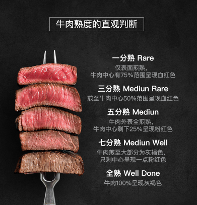 5成熟(MEDIUM):切开牛扒见断面中央50%肉为红色,带少量血水。
