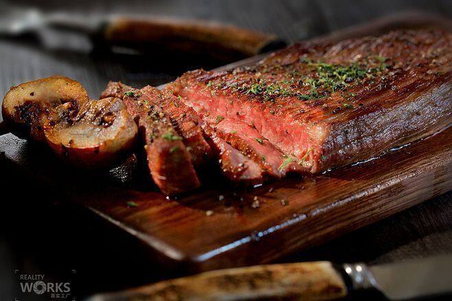 3成熟(RARE):切开牛扒见断面仅上下两层呈灰褐色,其间70%肉为红色并带有大量血水。
