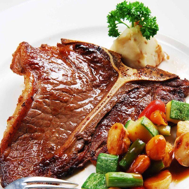 T-BONE(T骨牛扒),呈T字型,是牛背上的脊骨肉。T型两侧一边量多一边量少,量多的是肉眼,量稍小的便是菲力。此种牛排在美式餐厅更常见,由于法餐讲究精致,对于量较大而质较粗糙的T骨牛扒较少采用。